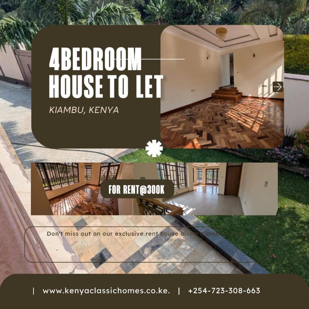 This elegant 4 bedroom house for rent in Kiambu offers comfort, space, and exclusivity in a prime location. Don’t miss the chance to make it your family home. Call or WhatsApp: 0723 308 663.