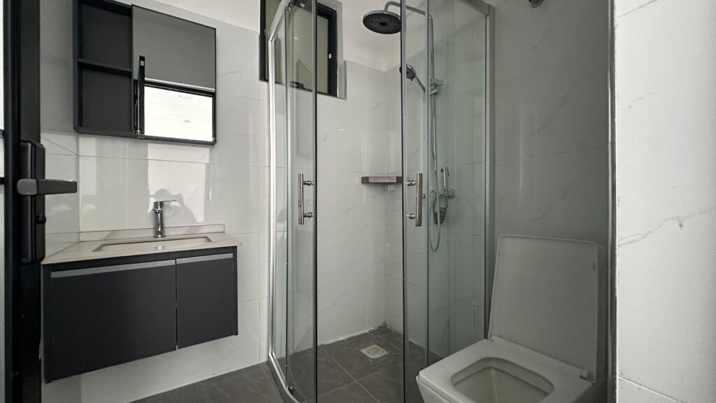 The bedroom is spacious, featuring built-in wardrobes and premium finishes that ensure both comfort and privacy. The elegant bathroom complements the apartment’s contemporary aesthetic, providing a calm, relaxing space after a busy day.